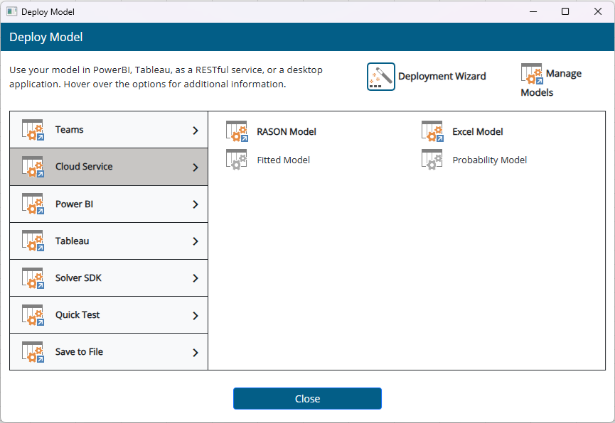 If you haven’t previously focused on the Deploy Model dialog, we encourage you to spend some time here: It’s the easy way to share your model results, or even your full solvable model, with others in your company, using Microsoft Teams, Power BI or Tableau, or our RASON Cloud Service.