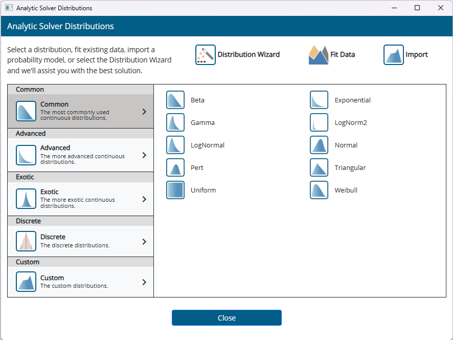 If you’re defining probability distributions, and you have sample data that you’d like to fit to a well-known type of distribution, you’ll find a Fit Data icon at the top of the main Distributions dialog, displayed when you click the Distributions icon on the Ribbon:
