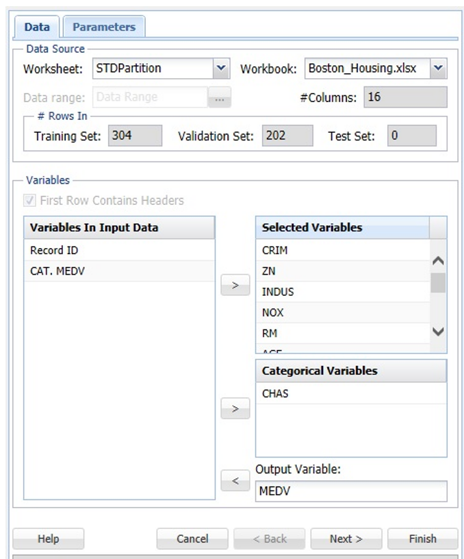 Select MEDV as the Output variable, CHAS as the Categorical Variable, and the remaining variables as Selected Variables (except the CAT.MEDV and Record ID variables). The last variable, CAT.MEDV, is a discrete classification of the MEDV variable and will not be used in this example.