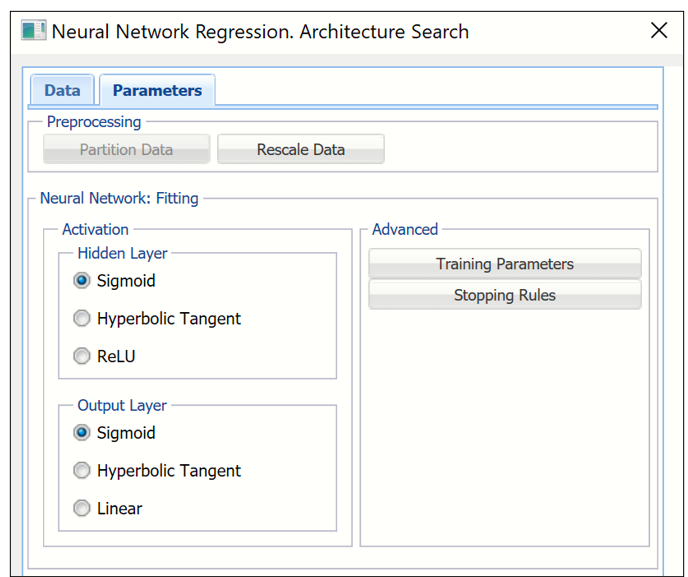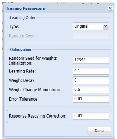 Users can now change both the Training Parameters and Stopping Rules for the Neural Network. Click Training Parameters to open the Training Parameters dialog. For information on these parameters, please see the Options section that occurs later in this chapter. For now, click Done to accept the default settings and close the dialog.