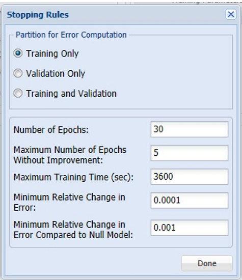 Click Stopping Rules to open the Stopping Rules dialog. Here users can specify a comprehensive set of rules for stopping the algorithm early plus cross-validation on the training error. For more information on these options, please see the Options section that appears later on in this chapter. For now, click Done to accept the default settings and close the dialog.