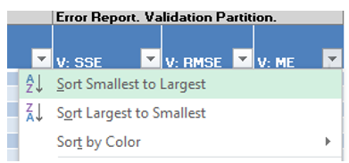Click the down arrow next to the last column heading, Validation:MSE (Mean Standard Error for the Validation dataset), and select Sort Smallest to Largest from the menu. Note: Sorting is not supported in AnalyticSolver.com.