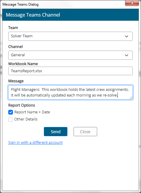 Next, you'll be prompted to select the Teams Channel best suited for communicating about these model results, and add a message for team members about the Excel workbook you are sharing.  This is a new, automatically created Excel workbook (default name TeamsReport.xlsx) that Analytic Solver will automatically save to your online file storage (SharePoint or OneDrive).  Note: The first time you use this facility, the Teams application may ask you to grant permissions to Analytic Solver to access the files and channels available to you (only) -- be sure to grant permissions!
