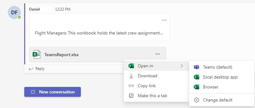 When you click the Send button, you should see a confirmation message from Analytic Solver that "the file was successfully sent to Teams".  Then you can go to Teams (desktop or browser-based version) and, in the channel you specified, you'll see your message and the attached Excel workbook as the latest update in the channel.  And now the easiest part of all: Just click the "..." next to the filename TeamsReports.xlsx to give yourself several options for viewing or working with the model results: