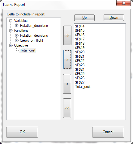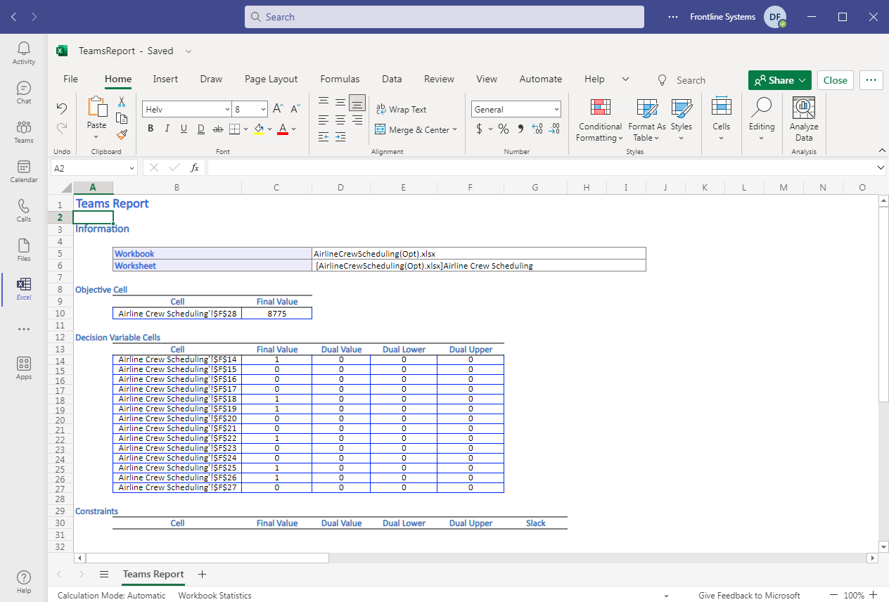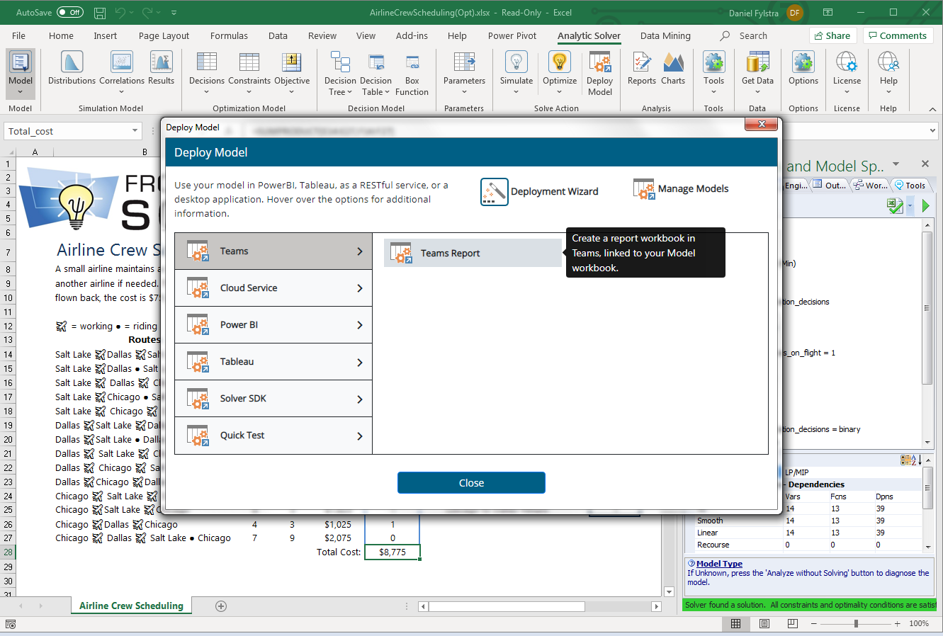 Let's say you've just finished building the Airline Crew Scheduling model, included among those found at Help - Example Models - Optimization Models.  You want to share the model results -- the crew assignments and the optimal cost -- but not the actual Analytic Solver model itself, with your colleagues via Teams.  Just click the Analytic Solver Ribbon button Deploy Model, then click Teams Report: