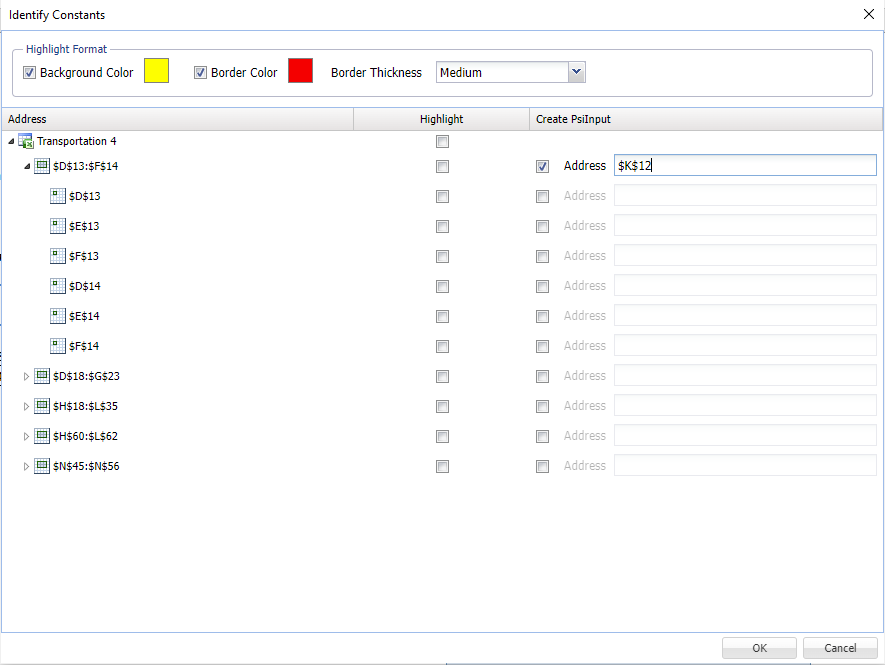 Now you can choose Tools – Identify Inputs and get help doing exactly that. This tool uses our PSI Interpreter to scan your model formulas, identify and list only those cell ranges that are candidates for data updates that will affect the model when solved. You can then pick and choose from a list of cell ranges, which ones you actually need to update for a new run. Here's an example, from our "Transportation of Goods" example model:
