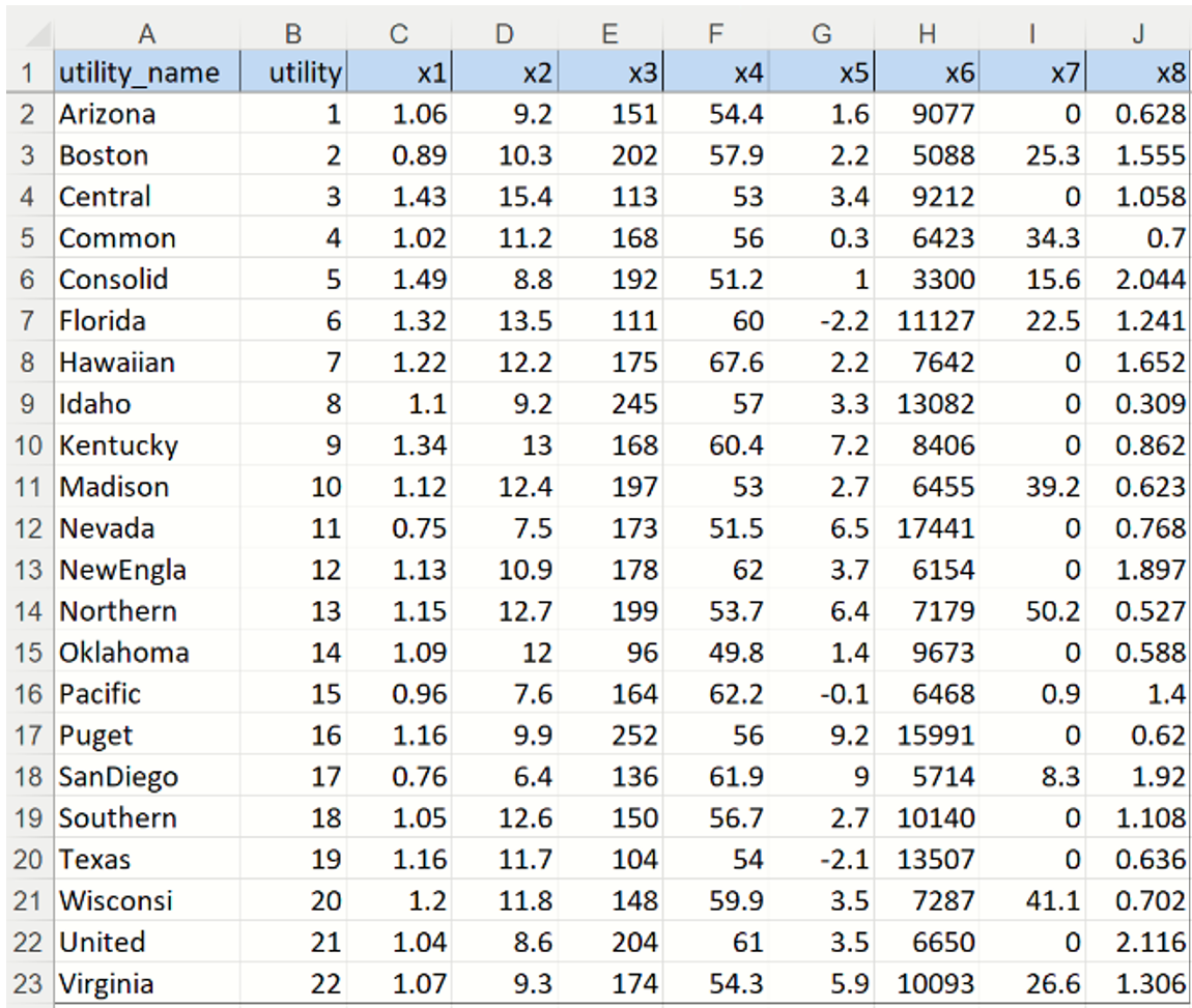 The utilities.xlsx example dataset (shown below) holds corporate data on 22 US public utilities. This example will illustrate how a user could use Analytic Solver Data Science to perform a cluster analysis using hierarchical clustering.