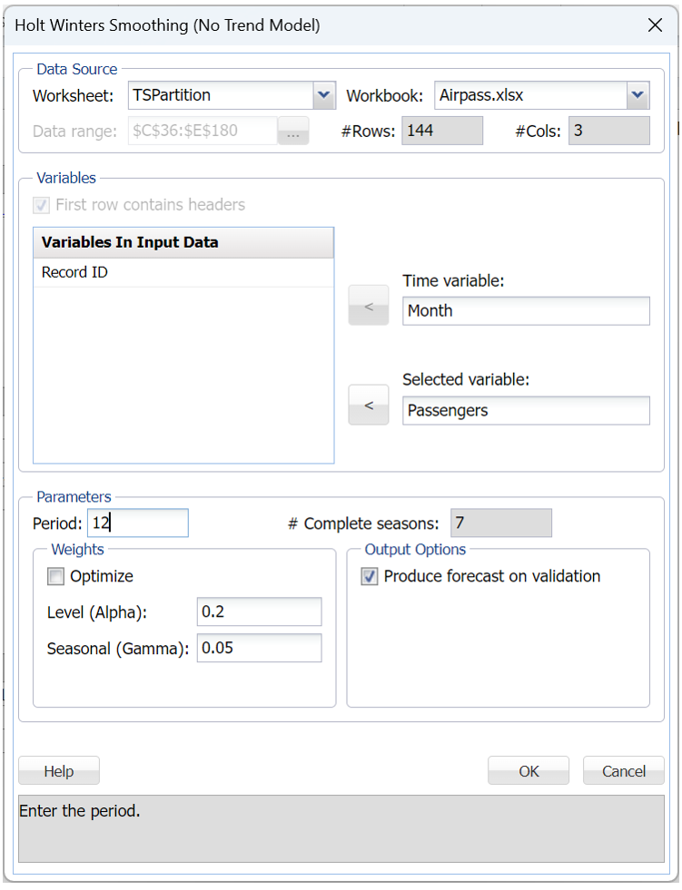 It takes a full 12 months to complete the seasonality cycle so enter 12 for Period, # Complete seasons is automatically entered with the number 7.  This example will use the defaults for the three parameters: Alpha, Beta, and Gamma.