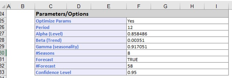 Click OK to run the smoothing technique.  NoTrendHoltWinters and NoTrendHoltWinters_Stored are right of the TSPartition worksheet.