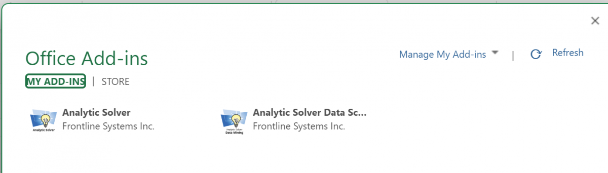 After you perform these steps (one time) to insert the Analytic Solver and Analytic Solver Data Science add-ins, they will appear under "My Add-ins". If you ever need to remove the add-ins, click the “…” symbol to the right of the add-in name, then click the Remove choice on the dropdown menu that appears.