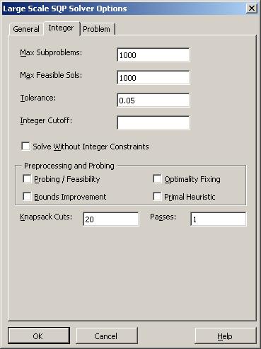 The Large-Scale SQP Solver uses Premium Solver Platform's Branch and Bound method to handle integer variables and "alldifferent" constraints. If your problem includes integer constraints, you can obtain a quick solution of the relaxation (temporarily ignoring the integer constraints) without having to delete these constraints and then re-enter them later. You can control the number of Branch and Bound subproblems and the number of integer feasible solutions found before the Solver stops. And you can speed up the solution of problems with integer constraints by supplying an integer cutoff value -- often known from a previous run. |