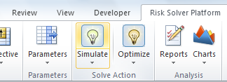 With an old-fashioned simulation software package, you'd press a button to start a simulation, then perhaps get a cup of coffee. Because simulations ran slowly, software packages were designed for "batch" operation: You'd spend time getting everything set up just right, run a simulation and wait (sometimes quite a while), then spend time analyzing the results. But with Risk Solver, simulations run so fast that fully Interactive Simulation is practical. To turn on Interactive Simulation, we simply click the Simulate light bulb on the Ribbon. It will “light up,” as shown below. In the blink of an eye, your first Monte Carlo simulation is complete!