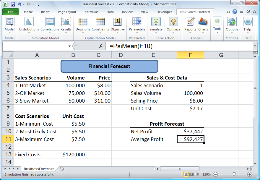So far, we've modified an ordinary spreadsheet model by defining selected cells as uncertain variables, and one cell (Net Profit) as an uncertain function. That's it! We now have a risk analysis model in the form required by Risk Solver. We're now ready to run a Monte Carlo simulation, and see how uncertainty affects our spreadsheet model.
