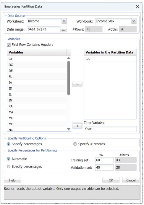 Now let’s take a look at an example that does not include seasonality.  Open the example dataset Income.xlsx.  This dataset contains the average income of tax payers by state.  First partition the dataset into training and validation sets using Year as the Time Variable and CA as the Variables in the partition data.