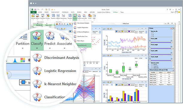 Analytic Solver Data Science - gives you easy to use, comprehensive data science and machine learning, text mining and predictive analytics in Excel. You can sample data from SQL databases, Power Pivot and Apache Spark, explore your data visually, clean and transform data, and create, evaluate and apply a full range of time series forecasting and data science models -- from multiple regression and logistic regression to classification and regression trees, neural networks, and association rules. Its speed will amaze you!
