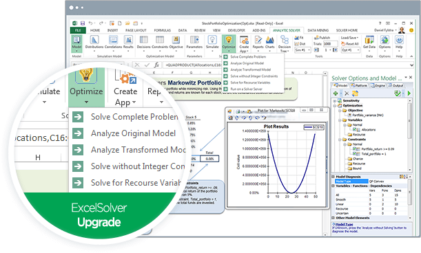 Analytic Solver Optimization - 100% upward compatible from the Excel Solver - handles every type and size of conventional optimization problem (without uncertainty). Unlike other optimization software, it algebraically analyzes your model structure and maximally exploits multiple cores in your PC. You can solve nonlinear models 10 times larger, and linear models 40 times larger than the Excel Solver, get solutions much faster – and plug in Solver Engines to handle up to millions of variables!