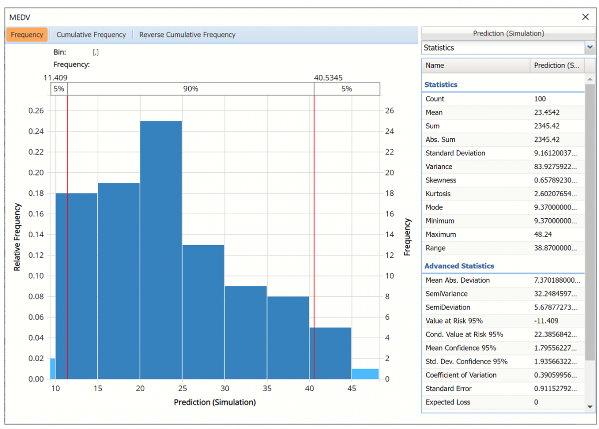 As discussed above, Analytic Solver Data Science generates a new output worksheet, RRandTrees_Simulation, when Simulate Response Prediction is selected on the Simulation tab of the Randon Trees Regression dialog.