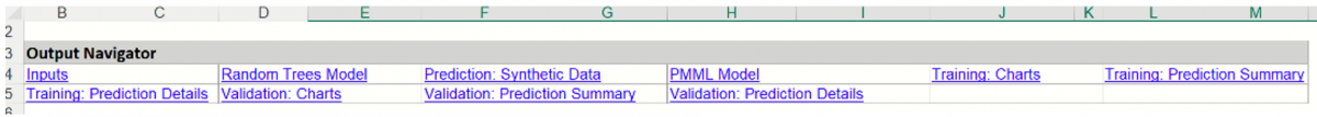 Output Navigator: Double click RRandTrees_Output to view the Output Navigator, which is inserted at the top of each output worksheet. Click any link in this table to navigate to various sections of the output.