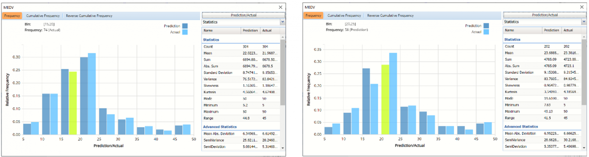 When Frequency Chart is selected, a frequency chart will be displayed when the RRandTrees_TrainingScore and RRandTrees_ValidationScore worksheets are selected. This chart will display an interactive application similar to the Analyze Data feature, explained in detail in the Analyze Data chapter that appears earlier in this guide. This chart will include frequency distributions of the actual and predicted responses individually, or side-by-side, depending on the user’s preference, as well as basic and advanced statistics for variables, percentiles, six sigma indices.