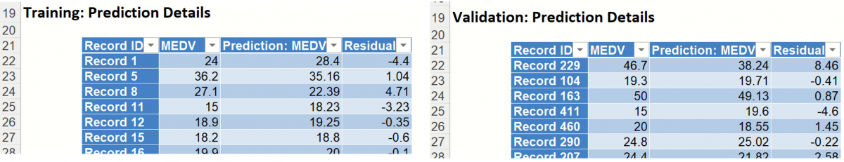 Training: Prediction Details: Scroll down to view the Prediction Details data table. This table displays the Actual versus Predicted values, along with the Residuals, for the training dataset.