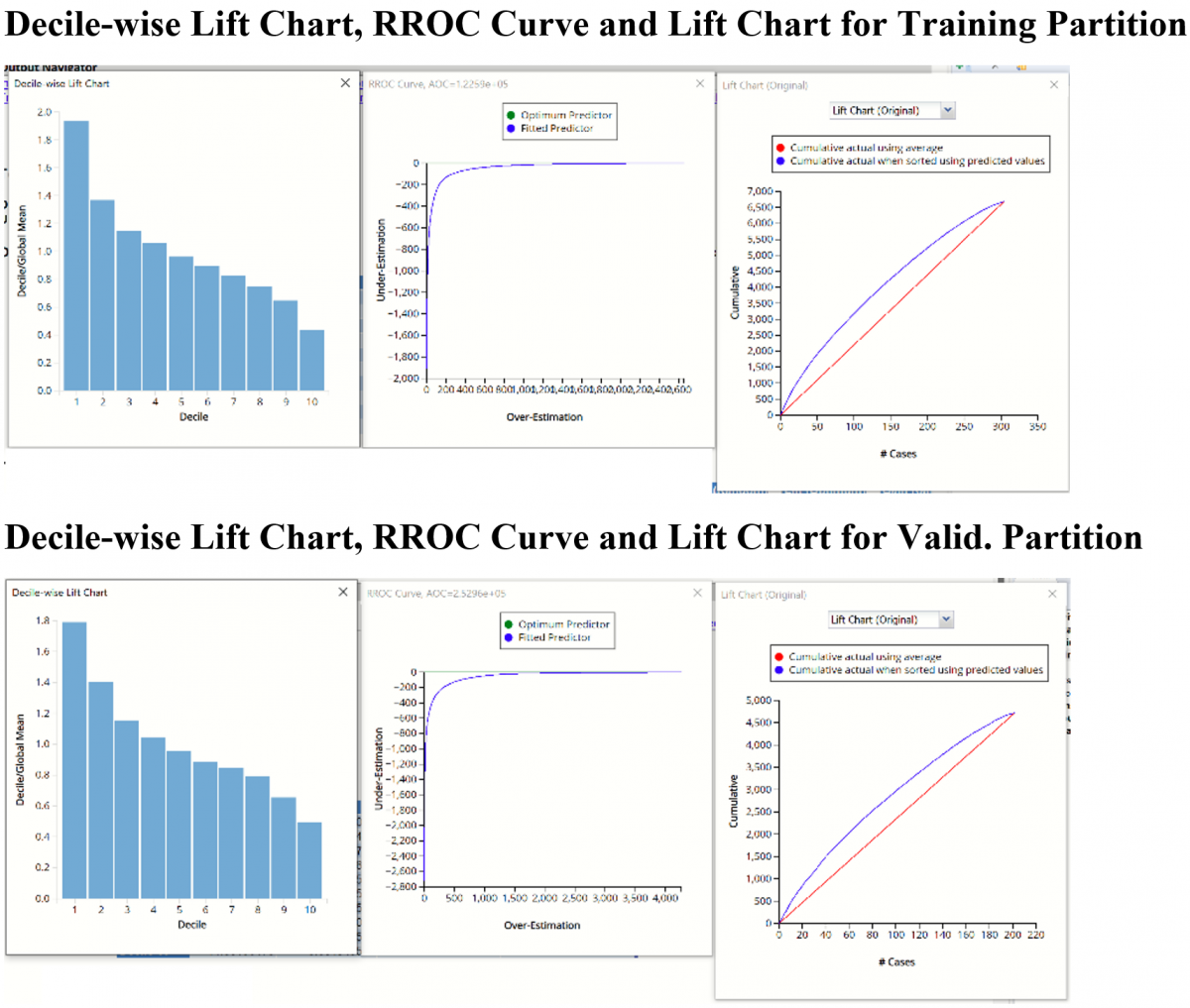 Click the RRandTrees_TrainLiftChart and RRandTrees_ValidLiftChart tabs to navigate to the Lift Charts and Regression RROC curves for both the training and validation datasets. For more information on how to interpret these charts, see Regression Trees.