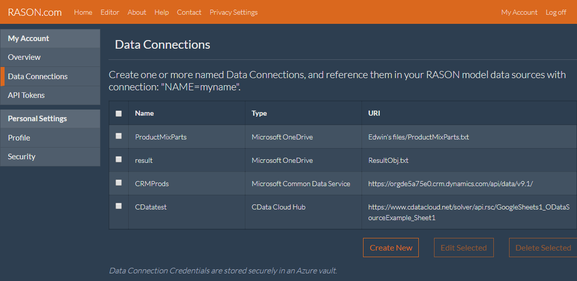 RASON makes it easy to use cloud data sources "in-place". For example, you can send an Excel workbook or CSV file from your computer to the RASON Server with your model, but it's easier to just save that file to OneDrive or OneDrive for Business, maintain it there (with multiple versions if you like), and use it directly in your RASON model. Besides OneDrive, the Common Data Service, and OData endpoints, RASON has built-in support for CData Corporation's Cloud Hub, which acts as a gateway to more than 100 different cloud data sources. Here's an example of the Data Connections tab on the RASON My Account page:
