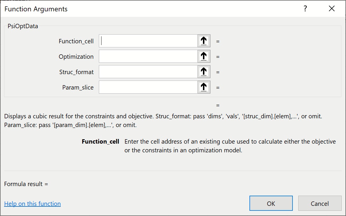 Function_cell: Enter an existing cube used to calculate either the objective or the constraints in an optimization modelOptimization: This argument is optional. This argument specifies the optimization number to which the function will be applied. If omitted, the optimization selected in the Ribbon will be used.