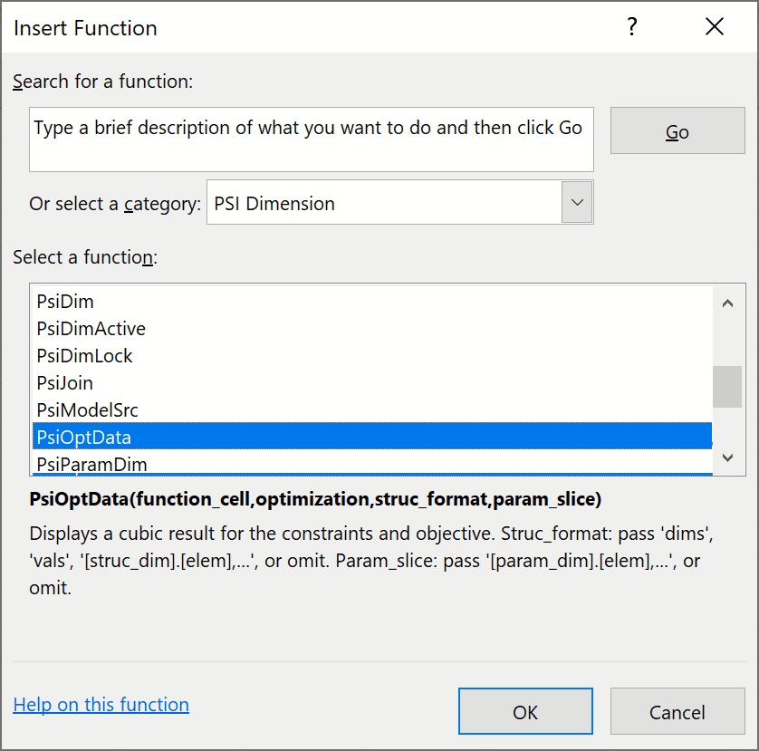 To insert the PsiOptData() formula, click Formulas – Insert Function on the Excel Ribbon, select Psi Dimension from the Or select a category dropdown menu, select PsiOptData from the list, then click OK.