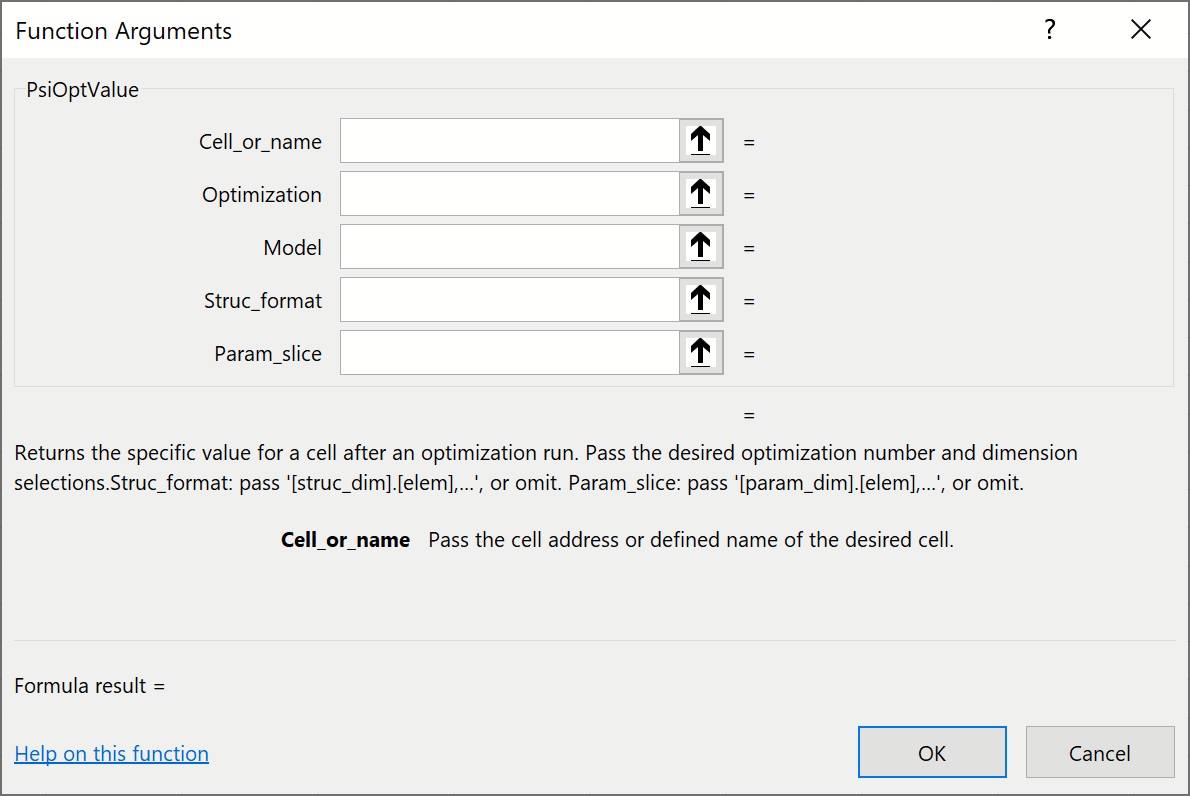 Address:  Displays the cell address range where the PsiOptValue function is located (read – only).