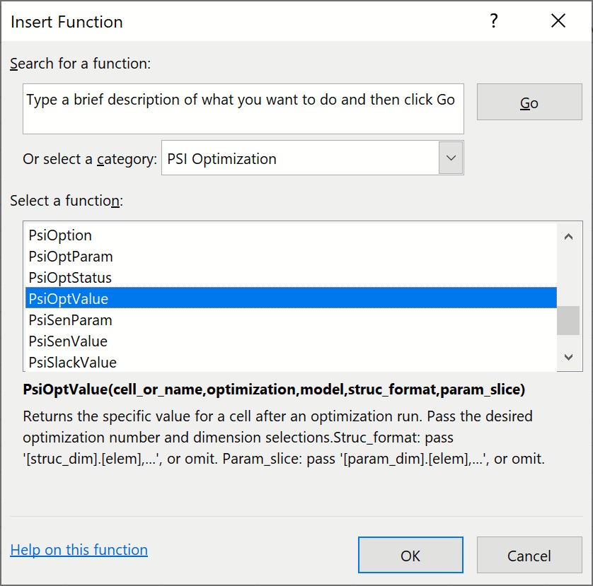 To insert PsiOptValue, click Formulas – Insert Function on the Excel Ribbon, select Psi Optimization from the Or select a category dropdown menu, select PsiOptValue.