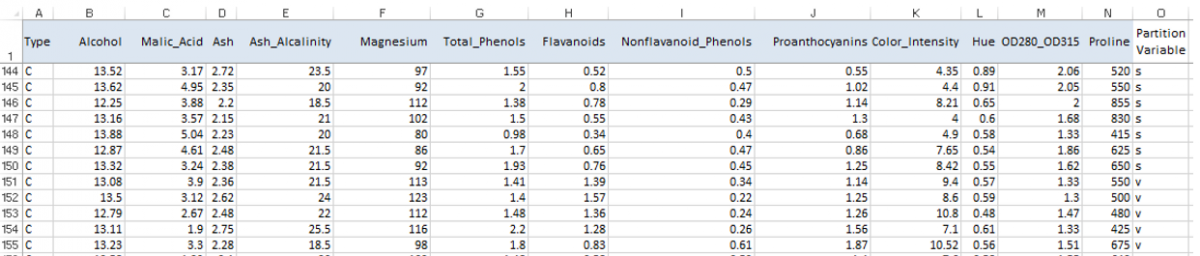 It is also possible for the user to specify which sets each observation should be assigned.  In column O, enter a “t”, “v” or “s” to indicate the assignment of each record to either the training dataset (t), the validation dataset (v), or the test dataset (s), as shown in the screenshot below.