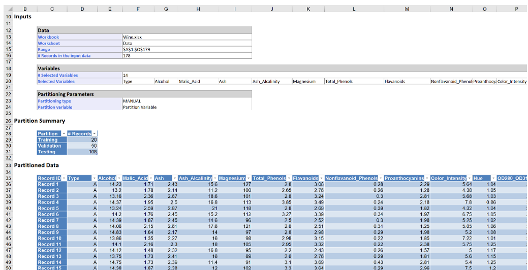 The example in this section illustrates how to use Analytic Solver Data Science’s partition utility to partition the example dataset, Wine.xlsx. Click Help – Example Models --  Forecasting/Data Science Examples to open.