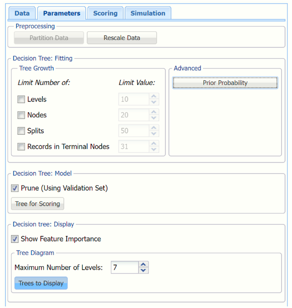 In the Tree Growth section, select Levels, Nodes, Splits, and Records in Terminal Nodes. Values entered for these options limit tree growth, i.e. if 10 is entered for Levels, the tree will be limited to 10 levels.