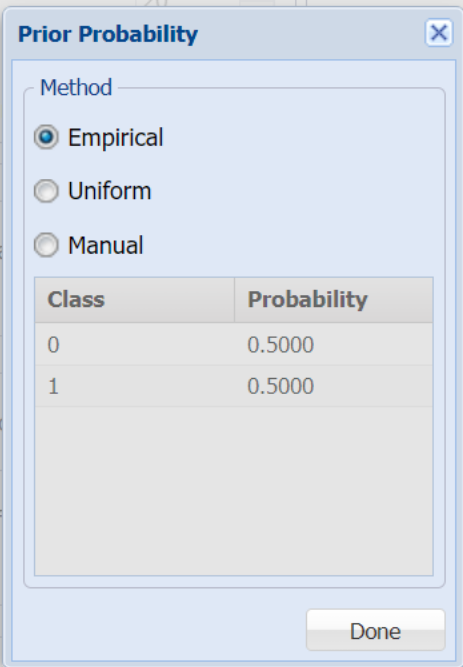 • If the second option is selected, Uniform, Analytic Solver Data Science will assume that all classes occur with equal probability.