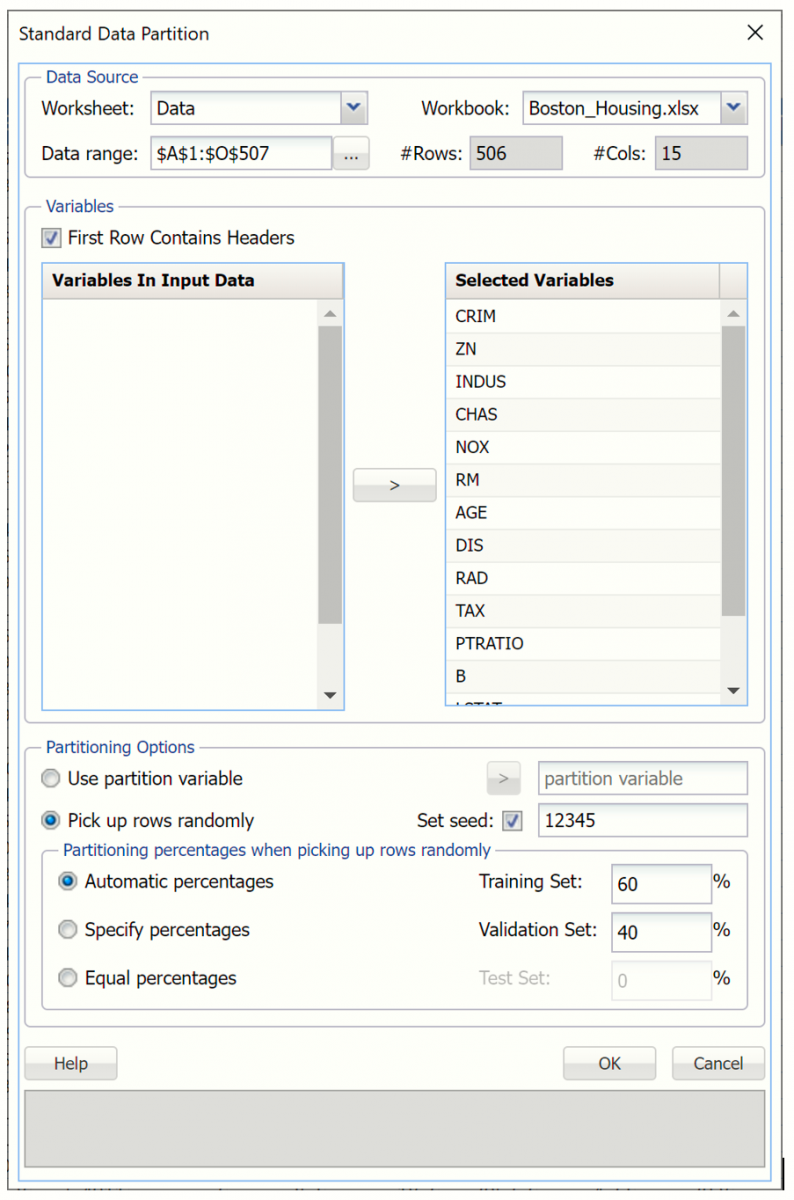 Click Help – Examples, then Forecasting/Data Science Examples to open the Boston_Housing.xlsx dataset.  This dataset includes fourteen variables pertaining to housing prices from census tracts in the Boston area collected by the US Census Bureau.