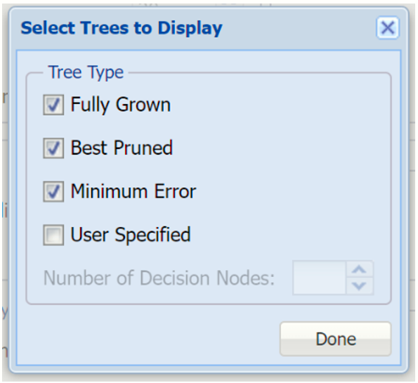 Select Trees to Display to select the types of trees to display:  Fully Grown, Best Pruned, Minimum Error or User Specified.