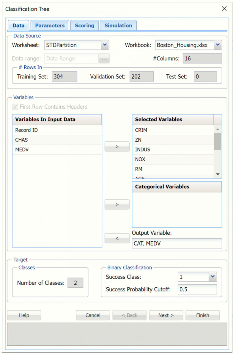 Select CAT. MEDV as the Output variable.  Then select all remaining variables except CHAS, MEDV and under Variables in Input Data, then click > to move them to the Selected Variables field.
