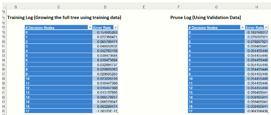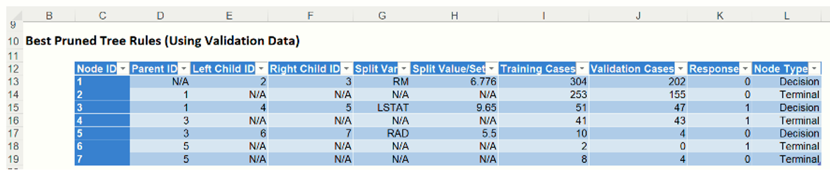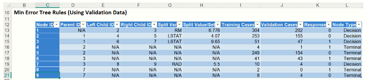 Analytic Solver Data Science chooses the number of decision nodes for the pruned tree and the minimum error tree from the values of Validation MSE.  In the Prune log shown above, the smallest Validation MSE error belongs to the trees with 4, 5, 6, 7, 8, 9, 10, 11 and 12 decision nodes.  Where there is a tie, meaning when multiple trees have the exact same Error Rate, the tree with the smaller number of nodes is selected.  In this case, the tree with four (4) decision nodes is the Minimum Error Tree – the tree with the smallest misclassification error in the validation dataset.