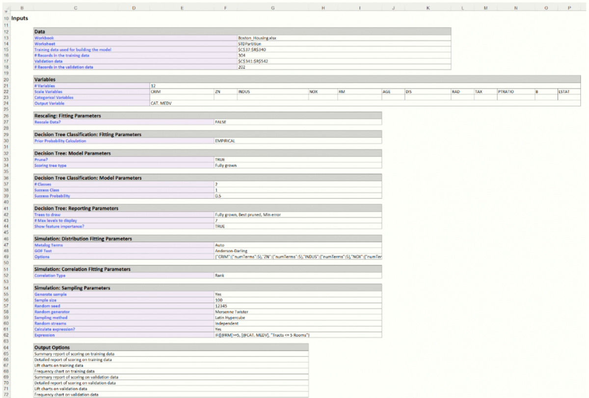 Note:  MEDV is not included in the Input since CAT. MEDV, derived from MEDV, is included in the model.  CHAS is not included in the Input since this is a categorical variable.  Recall that the new Simulation functionality included in Analytic Solver Data Science does not support categorical variables.