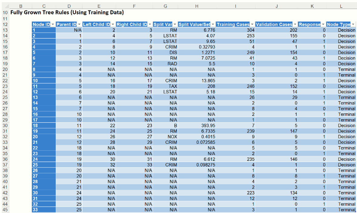 Node ID 1:  The first entry in this table shows a split on the RM variable with a split value of 6.776 (rounded to 6.78). The 304 total records in the training partition and 202 records in the validation partition were split between nodes 2 (LeftChild ID) and 3 (Rightchild ID).