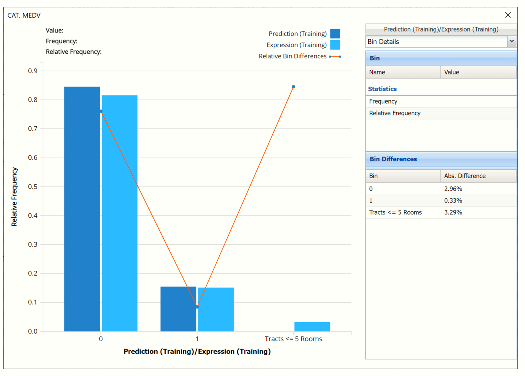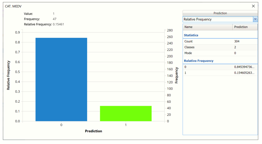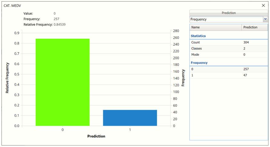 Click the Frequency chart to display the frequency for both the predicted and actual values of the output variable, along with various statistics such as count, number of classes and the mode.  Selective Relative Frequency from the drop down menu, on the right, to see the relative frequencies of the output variable for both actual and predicted.  See above for more information on this chart.