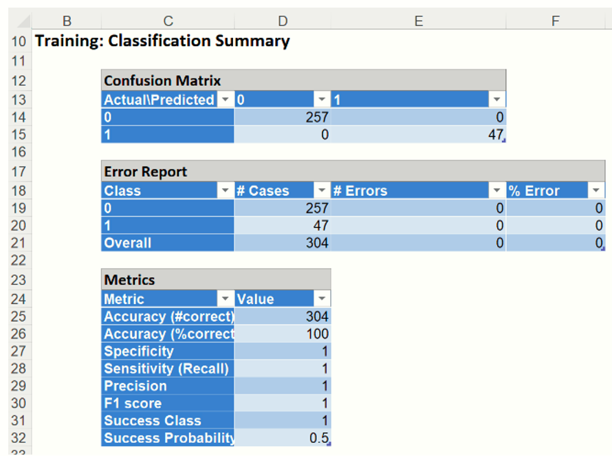 Click the CT_TrainingScore tab to view the newly added Output Variable frequency chart, the Training:  Classification Summary and the Training:  Classification Details report.  All calculations, charts and predictions on this worksheet apply to the Training data.