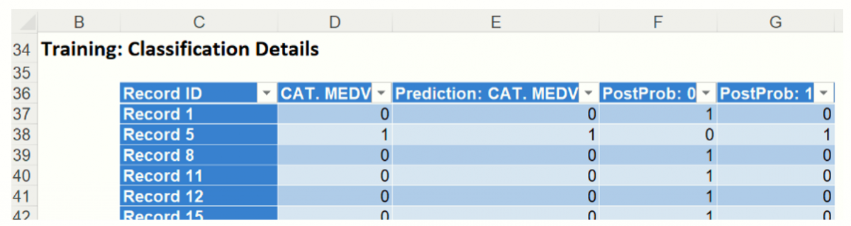 Classification Details:  This table displays how each observation in the training data was classified.  The probability values for success in each record are shown after the predicted class and actual class columns.