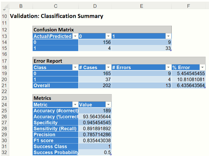 There were 13 cases misclassified in the validation dataset resulting in a % error of 6.44%.