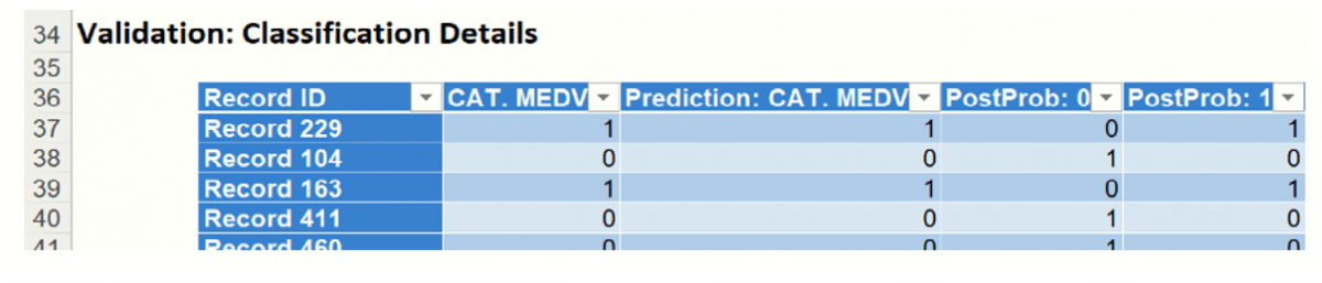 Classification Details:  This table displays how each observation in the validation data was classified.  The probability values for success in each record are shown after the predicted class and actual class columns.  Records assigned to a class other than what was predicted are highlighted in red.