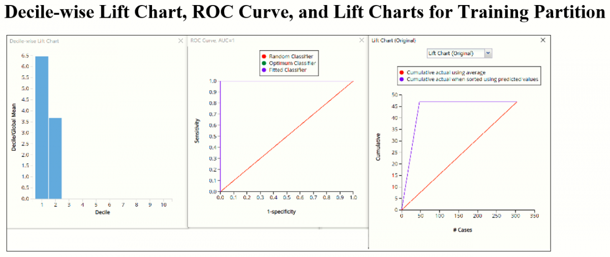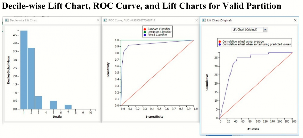 Click the CT_ValidationLiftChart tab to find the Lift Chart, ROC Curve, and Decile Chart for the Validation partition.  Click the CT_TrainingLiftChart tab to display these same charts created using the training partition.
