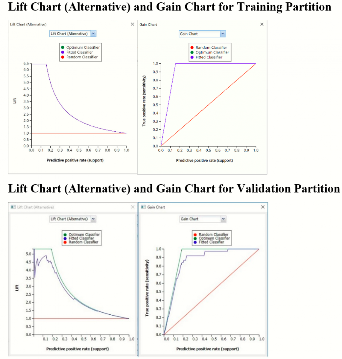 Lift Charts and ROC Curves are visual aids that help users evaluate the performance of their fitted models.  Charts found on the CT_Training LiftChart tab were calculated using the Training Data Partition.  Charts found on the CT_ValidationLiftChart tab were calculated using the Validation Data Partition.  It is good practice to look at both sets of charts to assess model performance on both datasets.