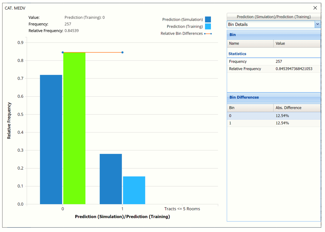 The chart that is displayed once this tab is selected, contains frequency information pertaining to the output variable in the training partition and the synthetic data.  In the screenshot below, the bars in the darker shade of blue are based on the synthetic data.  The bars in the lighter shade of blue are based on the predictions for the training partition.   In the synthetic data, a little over 70% of the census tracts are predicted to have a classification equal to 0, or low median value, while almost 30% of census tracts are predicted to have a classification equal to 1, or high median value.