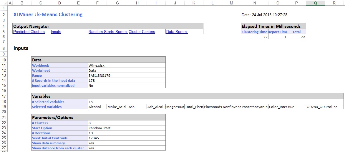 The example contained in this section uses the Wine.xlsx example file to demonstrate how to create a model using the k-Means Clustering algorithm.