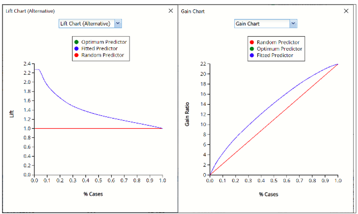 In V2017, two new charts were introduced:  a new Lift Chart and the Gain Chart.  To display these new charts, click the down arrow next to Lift Chart (Original), in the Original Lift Chart, then select the desired chart.